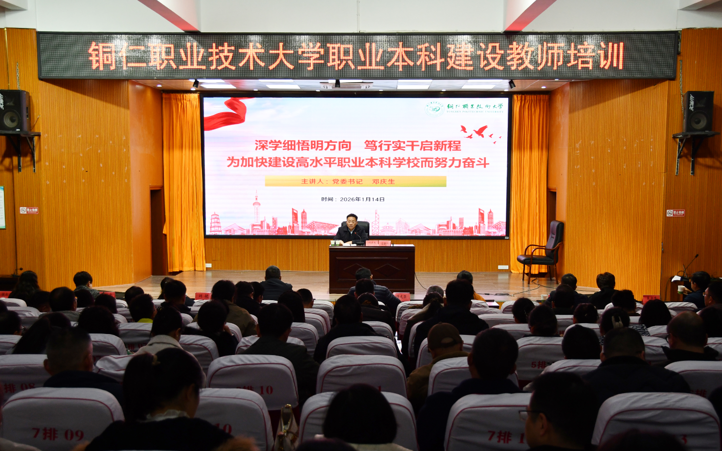 为深入学习贯彻党的二十届四中全会精神与学校第一次党员代表大会精神,引导全体教职工统一思想、凝聚共识,奋力推进高水平职业本科学校建设,1月14日,铜仁职业技术大学在寅亮厅举行贯彻党的二十届四中全会精神、学校第一次党代会精神专题宣讲会。学校党委书记邓庆生作宣讲报告,在家领导班子成员出席,全体教师参加。大会由党委副书记、校长项光亚主持。