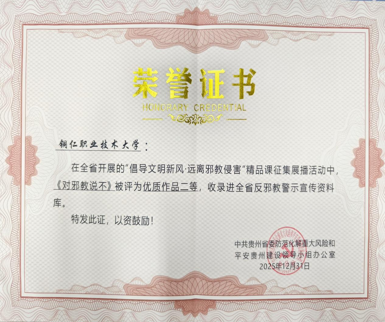 此次获奖作品《对邪教说不》正是在学校党委领导下,由统战部协同相关单位共同打造的一堂精品课。该课程主题鲜明、内容深刻、形式生动,有效提升了师生识别邪教、抵制邪教的能力,展现了铜仁职业技术大学在维护意识形态安全方面的责任与担当。