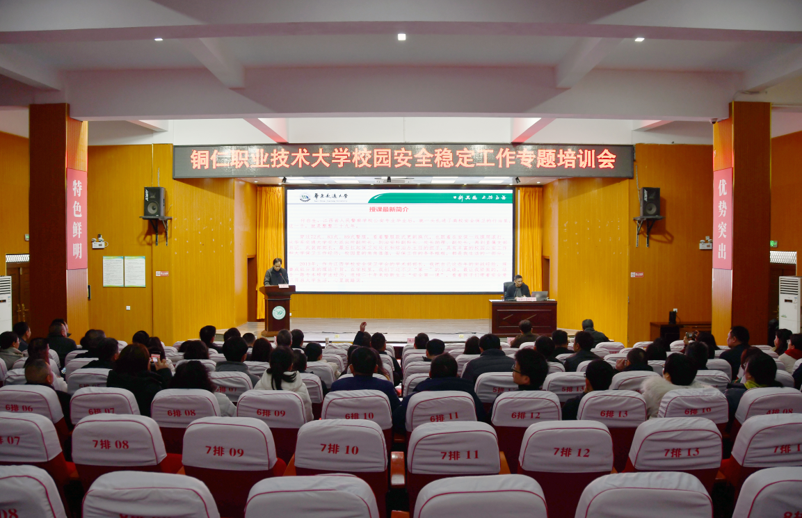 为深入贯彻落实上级关于平安校园建设的部署要求,全面提升学校安全管理水平,强化领导干部安全责任担当,3月11日上午,铜仁职业技术大学校园安全稳定工作专题培训会在寅亮厅召开。副校长朱锋钊主持会议,党委委员文晓棠、侯松林出席,全校副科级以上领导干部参加培训。