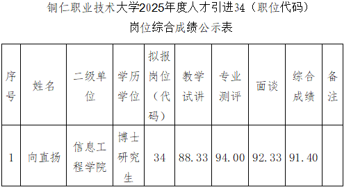 铜仁职业技术大学2025年度人才引进34(职位代码)岗位综合成绩公示