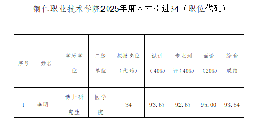 铜仁职业技术学院2025年度人才引进34(职位代码) 岗位综合成绩公示