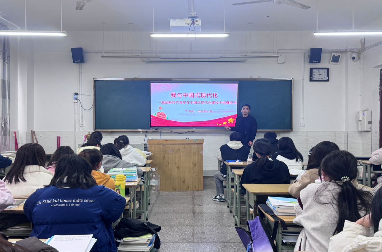 班会伊始,各班级通过播放《觉醒年代》《我和我的祖国》等影视片段,带领同学们回顾了不同历史时期青年的奋斗故事。从“为中华之崛起而读书”到“清澈的爱,只为中国”,报国精神始终是时代的强音。随后,各班辅导员(班主任)老师以《我与中国式现代化》为题进行宣讲,深入解读了中国式现代化的核心内涵——共同富裕、高质量发展、人与自然和谐共生等,并结合“两弹一星”精神、脱贫攻坚故事、航天精神等案例,强调青年一代在民族复兴征程中的责任与使命。