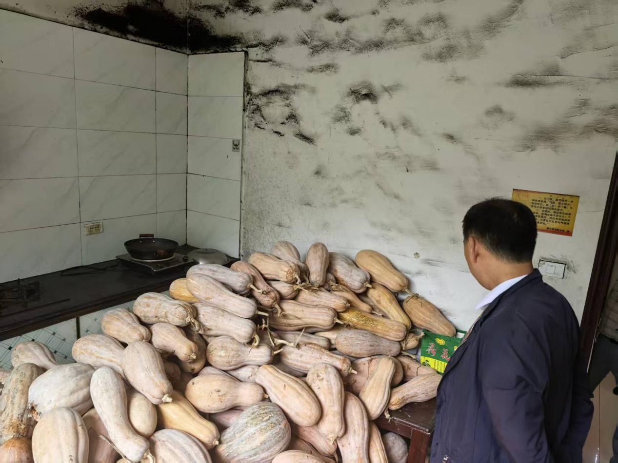 在寨桂村党群服务中心,后勤部调研团队与村干部、村民代表围坐交流,详细了解今年南瓜的种植规模、产量及滞销原因。“今年气候好,南瓜丰收了,但销路没跟上,几千斤南瓜堆在家里,眼看就要烂了。”村民的话语里满是焦急。调研团队随即前往村民家中查看,只见厨房、院落里堆满了个大饱满的南瓜,却因缺乏销售渠道而陷入“丰收愁”。