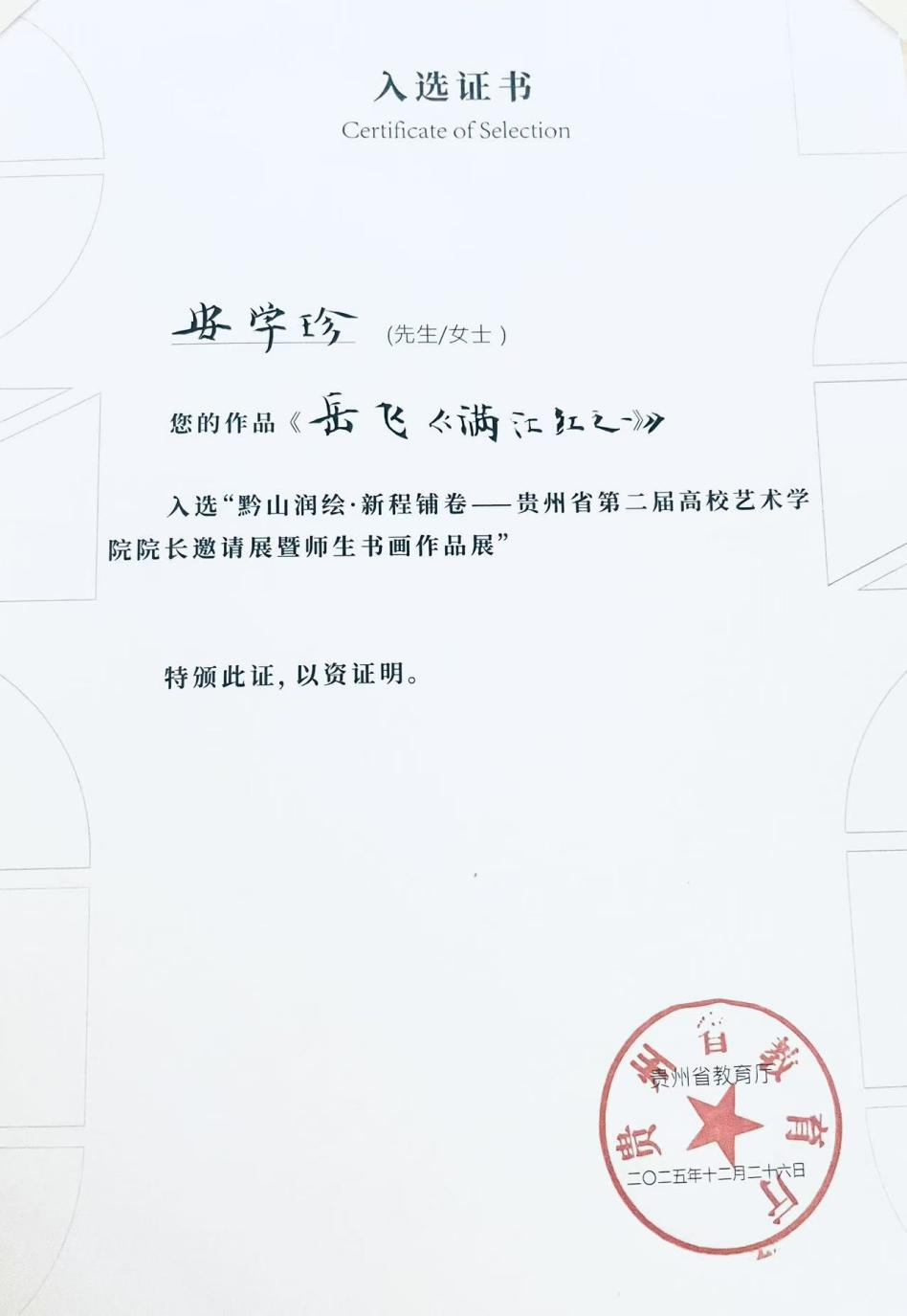 近日,贵州省教育厅主办的黔山润绘.新程铺卷贵州省第二届高校艺术学院院长邀请展暨师生书画作品展在贵州省美术馆展出。我校教师安学珍教授提交的软笔书法《岳飞.满江红》在本次活动中选拔展出。
