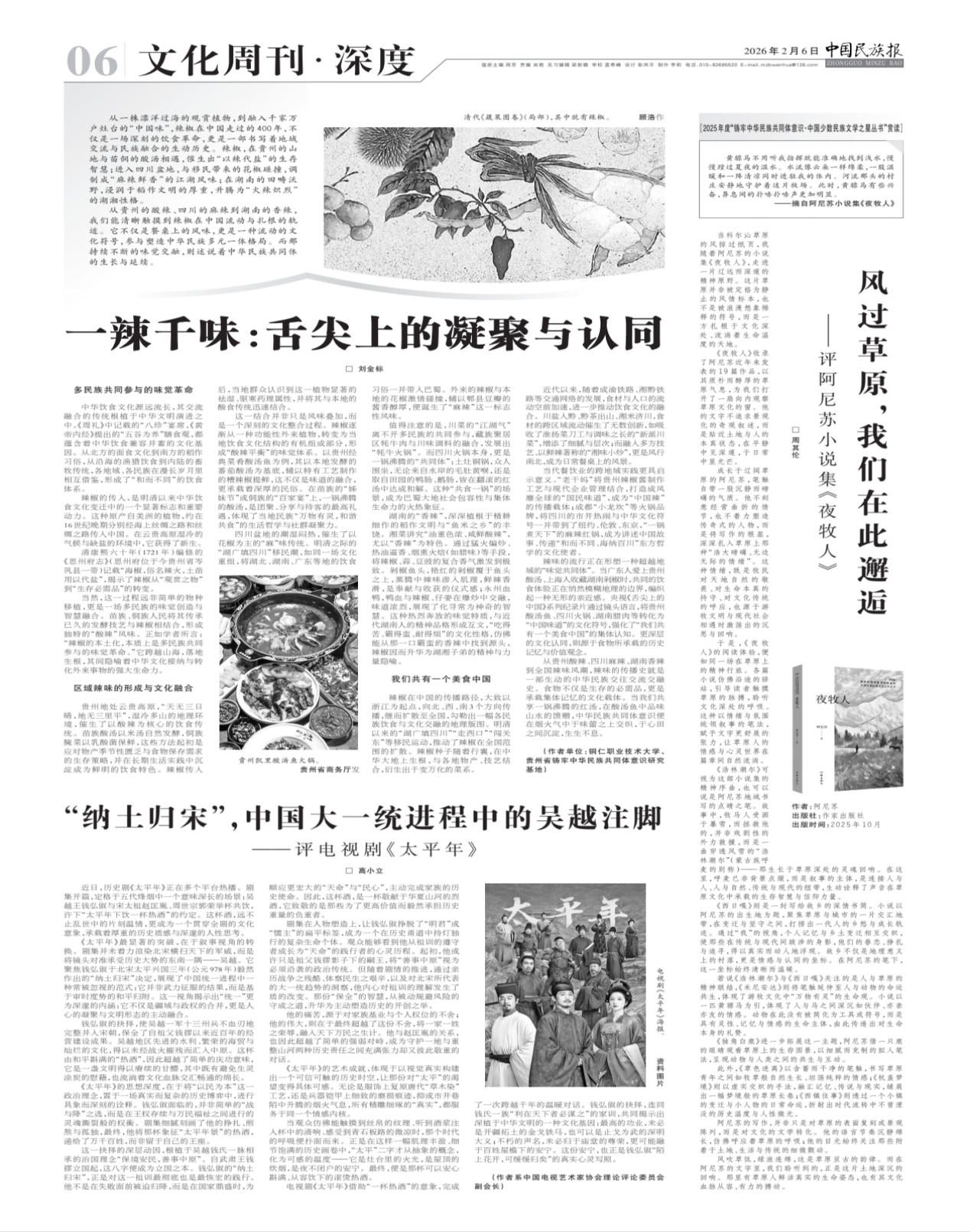 2月6日,我校刘金标博士撰写的学术文章《一辣千味:舌尖上的凝聚与认同》在民族类权威核心报纸《中国民族报》正式刊发。该文从饮食文化视角深入阐释了中华民族交往交流交融的历史进程,彰显了深厚的学术价值与现实意义。