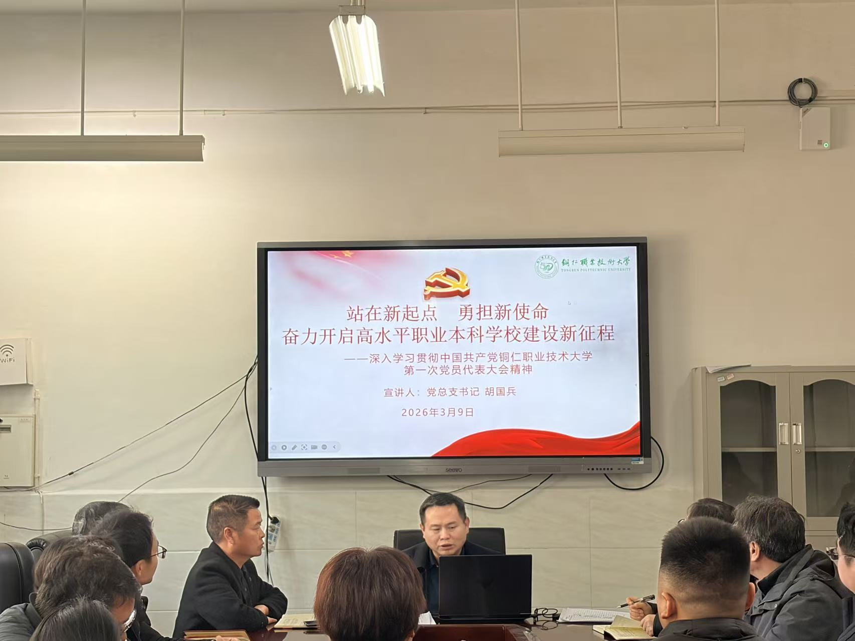 为深入学习贯彻中国共产党铜仁职业技术大学第一次党员代表大会精神,将全体党员的思想和行动统一到大会决策部署上来。2026年3月9日中午,医学院党总支书记胡国兵在善学楼203党员活动室为全体党员开展《站在新起点 勇担新使命 奋力开启高水平职业本科学校建设新征程》的专题宣讲。