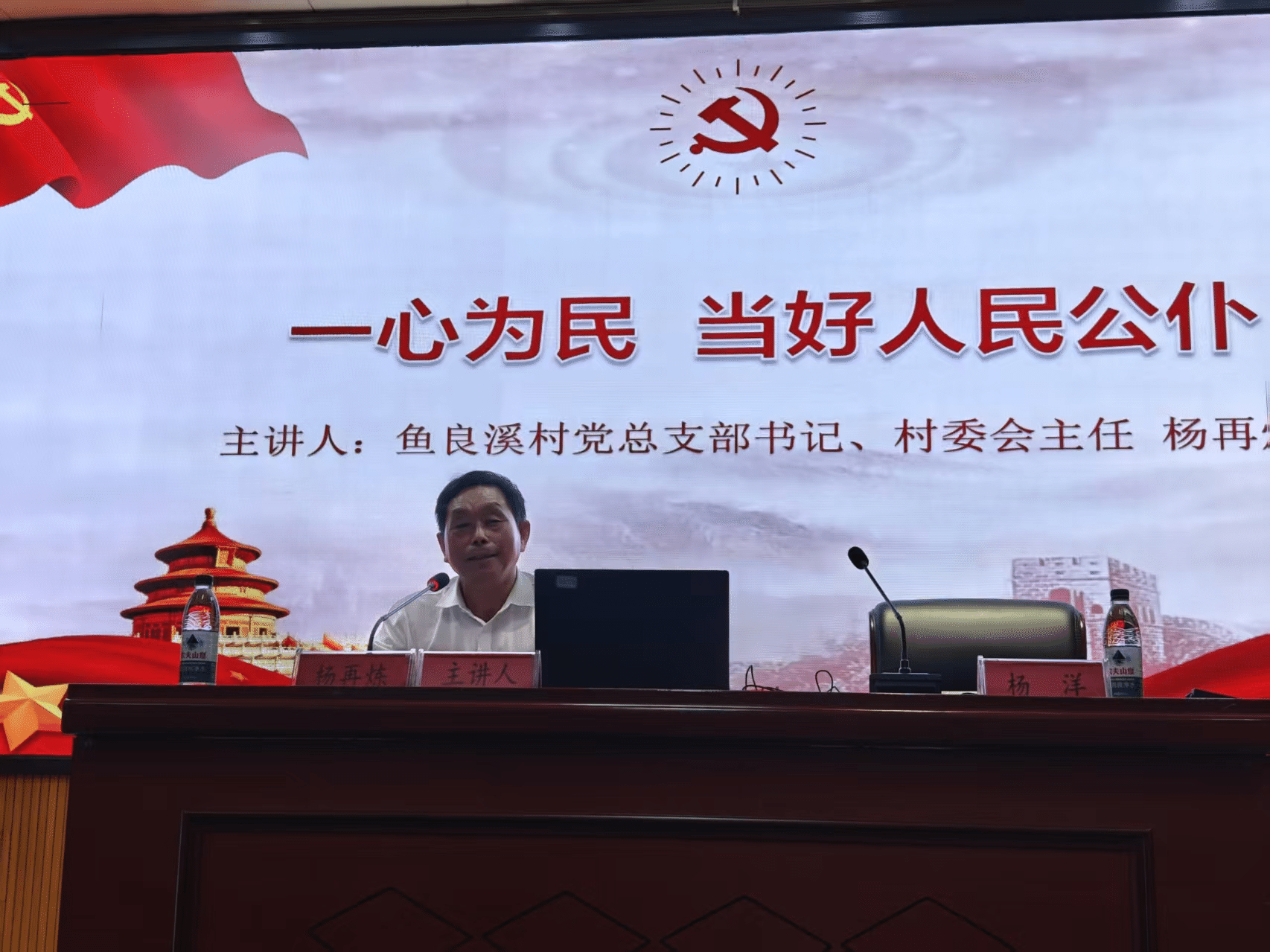 杨再炼以“一心为民,当好人民公仆”为主题,以鱼良溪村的蜕变历程为主线,结合自己多年的服务基层工作经验,分享了鱼良溪村在党建引领、产业发展、乡村治理等方面的先进做法和成功经验。他表示,鱼良溪村的跨越发展表明党建引领是关键,拓宽思路是基础,产业发展是根本,作为一名党员干部,要时刻牢记初心使命,以人民为中心,不断推动乡村振兴和村级集体经济发展。