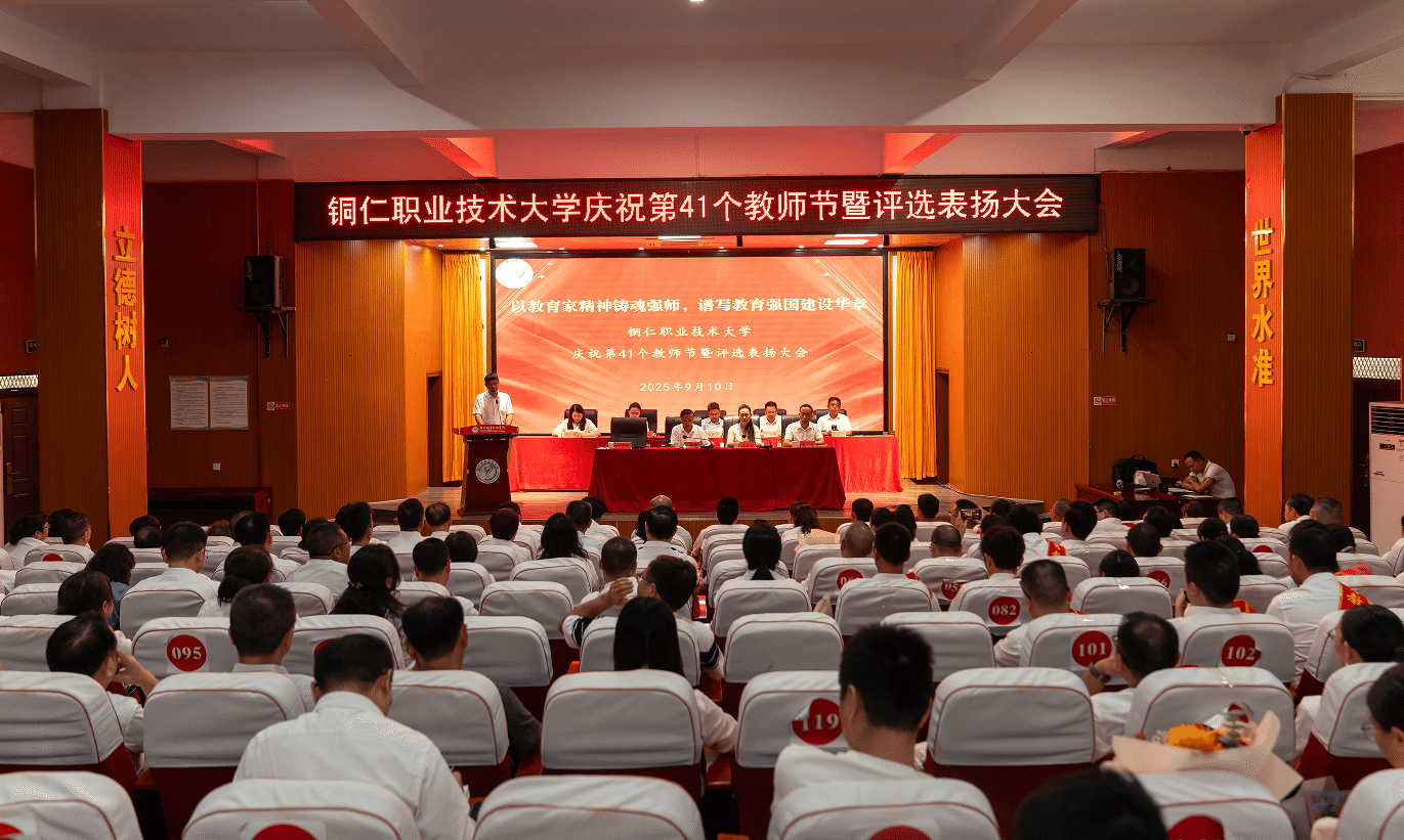 金秋送爽,硕果盈枝。9月10日上午,铜仁职业技术大学举行第41个教师节庆祝活动。活动以“以教育家精神铸魂强师,谱写教育强国建设华章”为主题,表扬先进典型、总结发展成果、凝聚奋进力量。学校党委书记张命华出席并讲话,学校领导班子成员出席,全体先进个人、副科级以上干部、离退休教职工代表及无课教师参加。活动由党委副书记、校长项光亚主持。