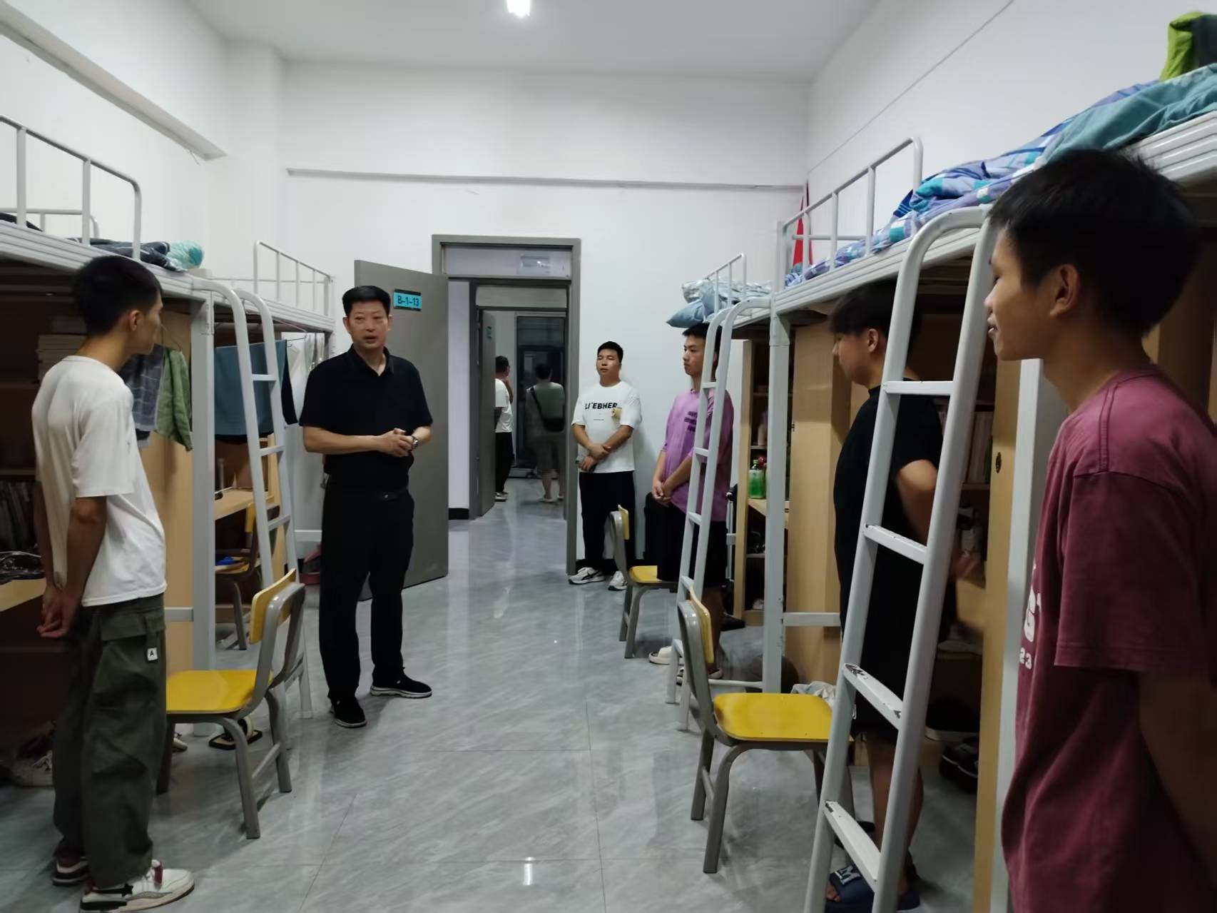 在学生宿舍,院领导与同学们亲切交流,了解假期留校安排,并提醒大家注意用电安全,严禁使用违规电器,保持楼道畅通,共同营造安全、整洁的生活环境。
