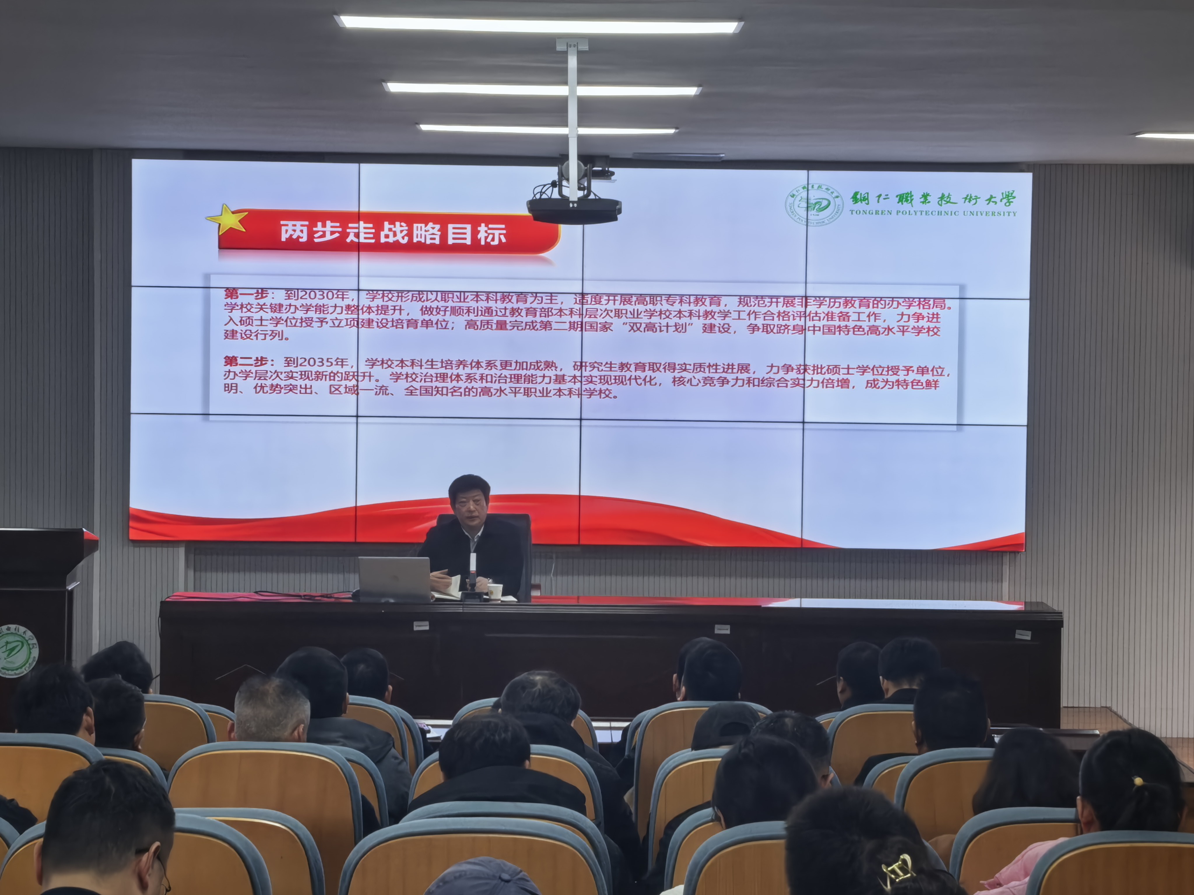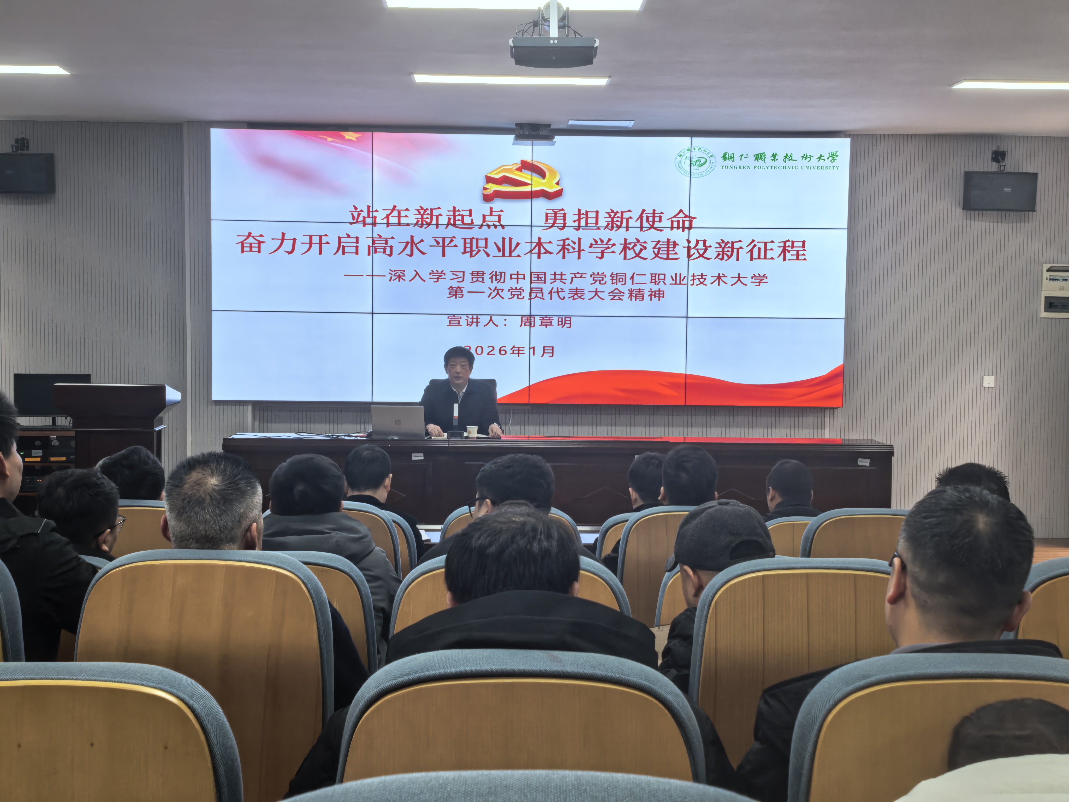 为深入学习领会中国共产党铜仁职业技术大学第一次党员代表大会精神,切实把全院师生的思想和行动统一到大会决策部署上来,1月16日,工学院党总支书记周章明以“站在新起点 勇担新使命 奋力开启高水平职业本科学校建设新征程”为主题,向全院教职工开展专题宣讲。