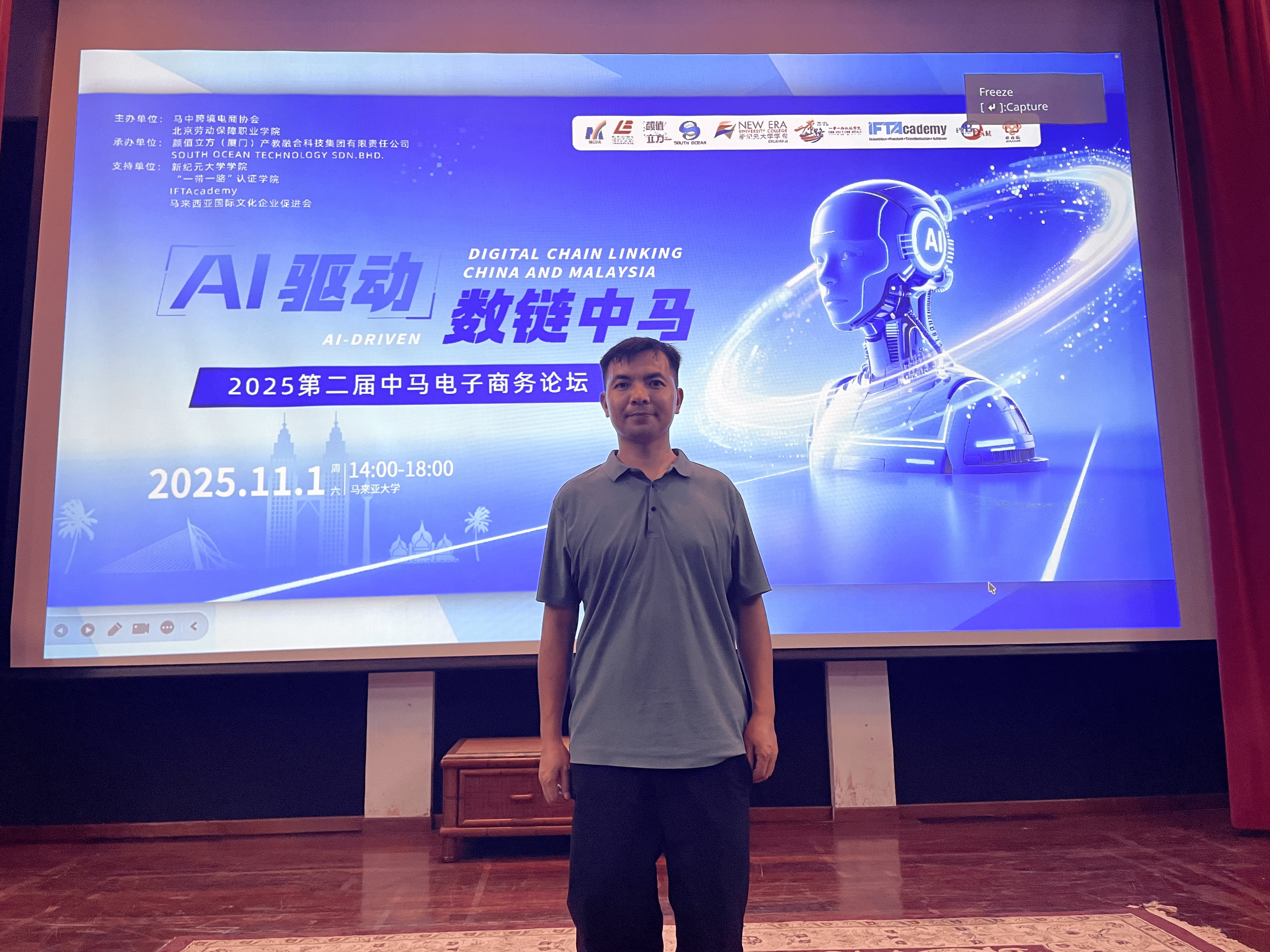 11月1日,“AI驱动·数链中马——2025第二届中马电子商务论坛”在马来西亚首都吉隆坡马来亚大学(University of Malaya)圆满举行,作为第47届东盟峰会后首场落地的“AI+跨境电商”主题活动,本次论坛由马中跨境电商协会与北京劳动保障职业学院主办,颜值立方(厦门)产教融合科技集团与South Ocean Technology Sdn.Bhd.承办。此次论坛吸引了来自政府单位、行业协会、知名高校、跨境企业与直播电商机构的150余名代表出席。铜仁职业技术大学受邀参加,我校经济与管理学院肖祥应、国际教育学院罗禹奚、药学院张元彪三位在马读博青年教师应邀出席。