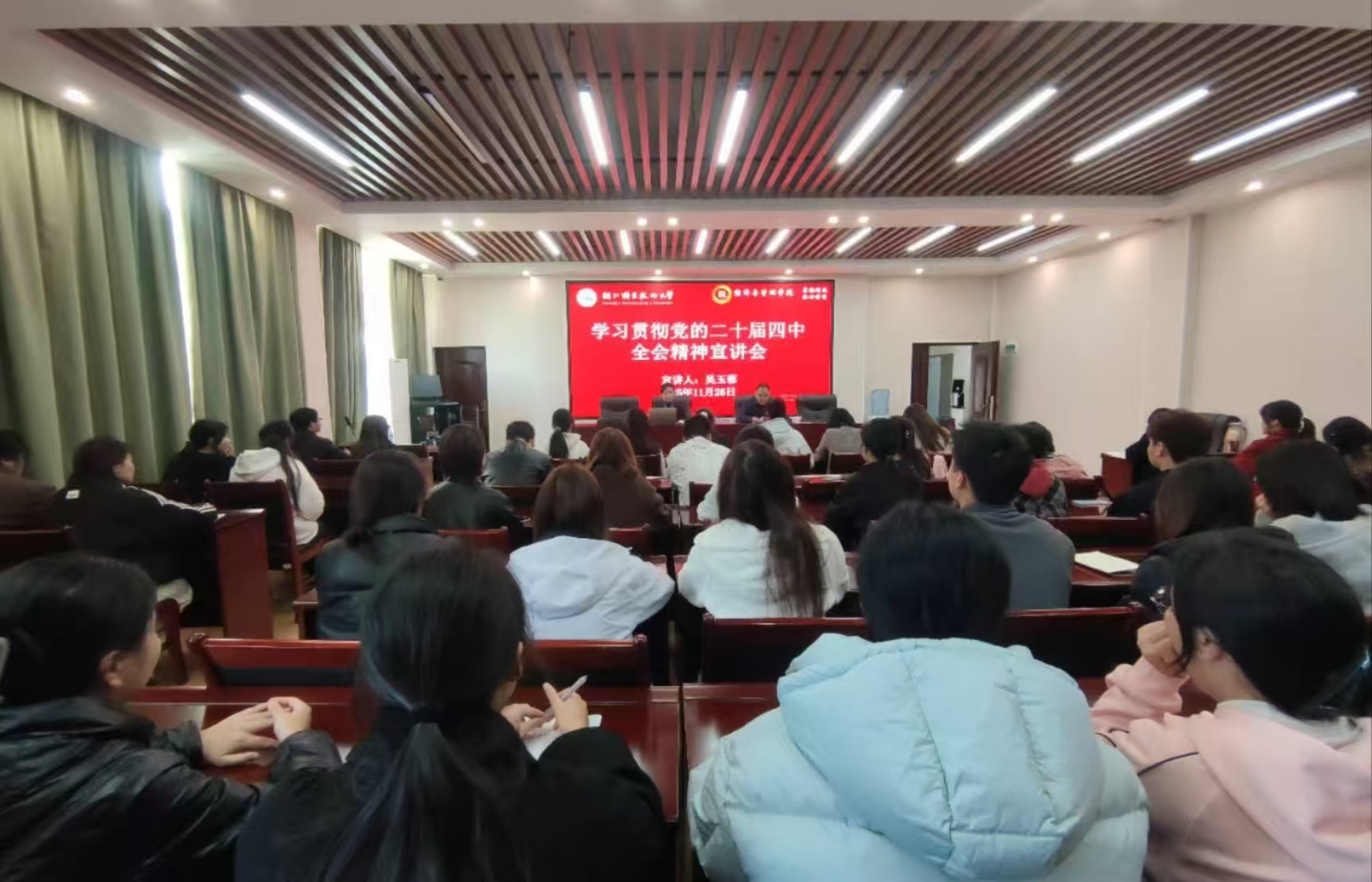 为深入学习宣传贯彻党的二十届四中全会精神,推动全会精神在学院落地生根,11月26日,经济与管理学院党总支部副书记吴玉蓉在致知楼学术报告厅向学院师生宣讲党的二十届四中全会精神。