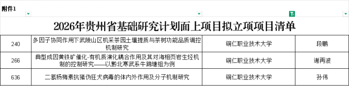 近日,贵州省科技厅公布了2026年贵州省基础研究计划拟立项项目名单,我校喜获三项面上项目拟立项,分别为:农学院段鹏老师主持的《多因子协同作用下武陵山区机采茶园土壤提质与茶树功能品质调控机制研究》、孙伟老师主持的《二氢杨梅素抗猪伪狂犬病毒的体内外作用及分子机制研究》,以及工学院谢再波老师主持的《典型成因黄铁矿催化-有机质演化耦合作用及其对海相页岩生烃机制的控制研究——以黔北寒武系牛蹄塘组为例》。