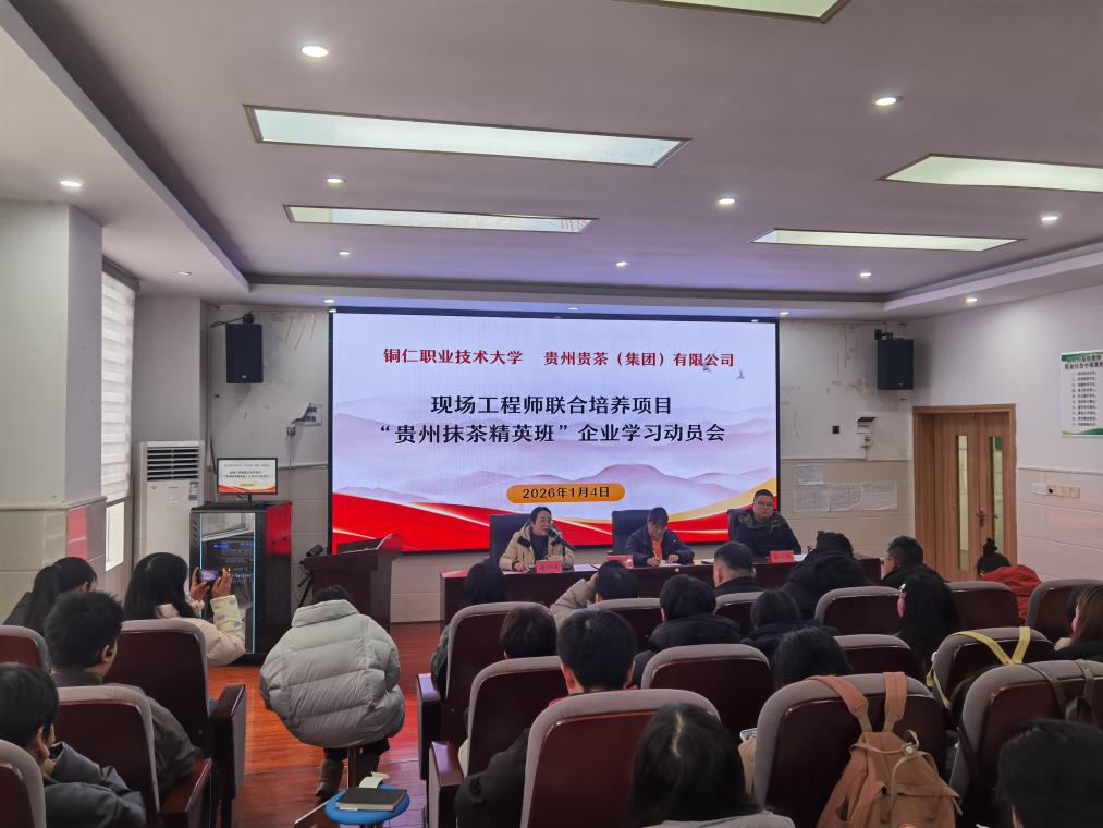 为深化产教融合、推进现场工程师联合培养项目,确保“贵州抹茶精英班”企业学习阶段有序开展,2026年1月4日,在农学院102报告厅召开了铜仁职业技术大学与贵州贵茶(集团)有限公司联合培养项目“贵州抹茶精英班”企业学习动员会。农学院党总支书记冯海鹰、教务科科长段小凤、学生科科长符天剑、茶叶生产与加工技术专业教师及“贵州抹茶精英班”全体学员参会,段小凤主持会议。