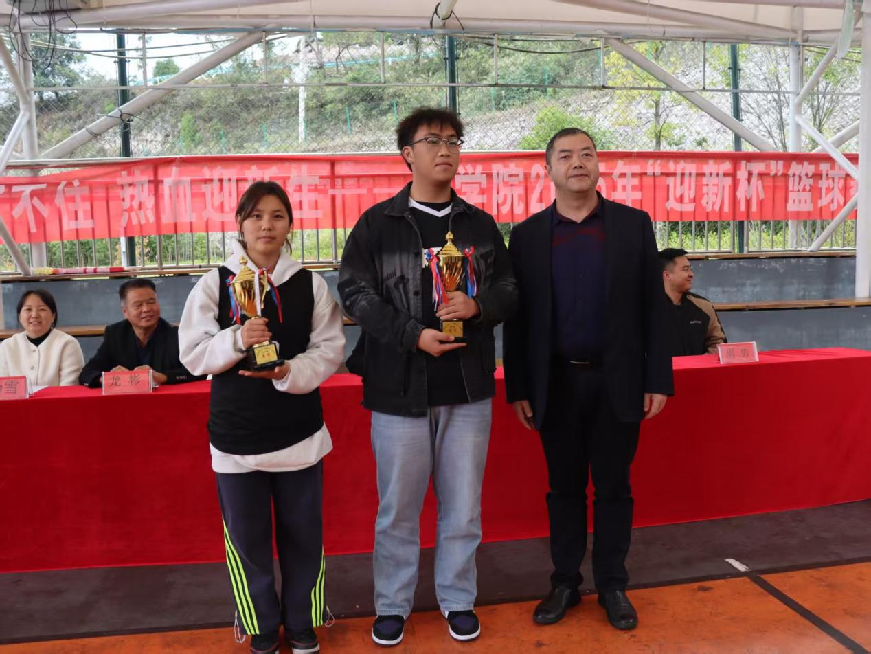 闭幕式上,主持人首先宣读了本次篮球赛优秀裁判、优秀记录员、优秀运动员及优秀工作者的表彰名单,随后进入最激动人心的颁奖环节。学生科科长杨雪为男女MVP颁发奖牌,游霞凭借赛场上的敏捷身手与多次关键得分,再次当选女队MVP;苟俊伟则以出色的赛场掌控力与突出的团队贡献,获评男队MVP。紧接着,院领导分别为冠军、亚军、季军队伍颁发奖杯并合影留念,与队员们一同定格这一荣耀时刻。