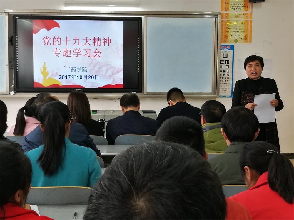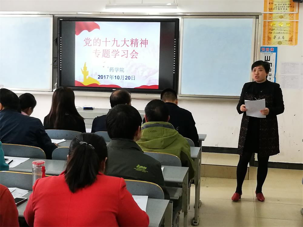 10月20日中午,药学院召开党的十九大精神专题学习会。党总支书记文晓棠带领全体教职工重温了习近平总书记代表十八届中央委员会向大会作的《决胜全面建成小康社会 夺取新时代中国特色社会主义伟大胜利》报告的主要内容。党的十九大是在我国全面建成小康社会决胜阶段、中国特色社会主义发展关键时期召开的一次肩负重大使命的重要大会,党的十九大报告内容十分丰富、蓝图十分宏伟、任务十分艰巨,文晓棠要求全体教职工要认真学习、深刻领会大会精神,脚踏实地,立足本职工作,不断促进学院工作健康发展。