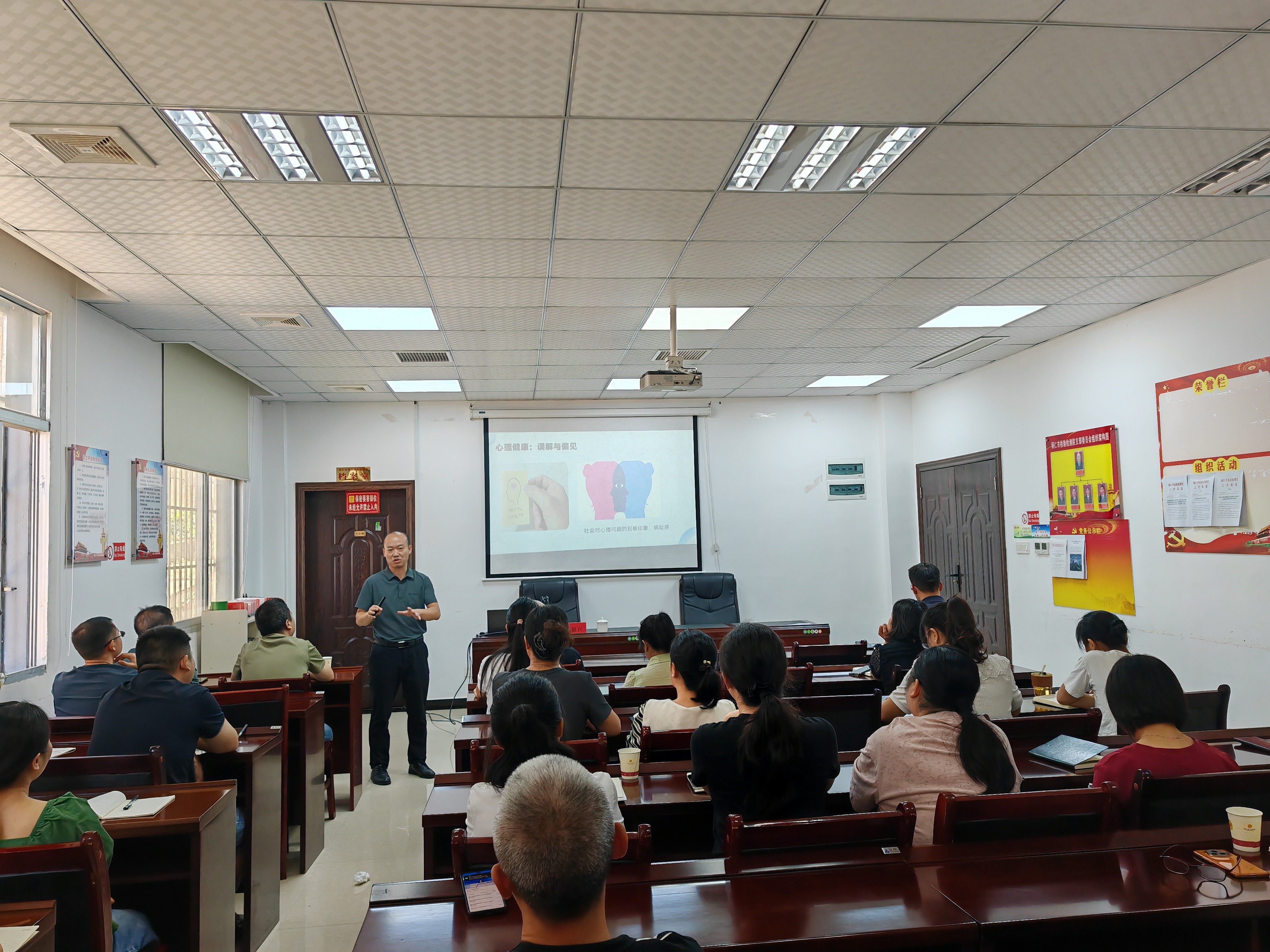 胡主任从心理健康定义、心理问题信号识别、心理调适方法及专业援助途径四个方面展开讲解。他指出,健康心理不是没有困扰,而是能有效应对压力的“心理弹性”,呼吁大家像重视身体健康一样日常关注心理状态。他借助“内心天气预报”的比喻,提醒职工留意情绪、睡眠、社交等方面的变化,并简要介绍自评工具,帮助职工评估自身情绪。围绕心理调适,胡老师推荐了正念呼吸、“三问法”应对消极思维、“5分钟行为激活”重建生活控制感等方法,并强调运动、饮食、睡眠和社会支持的重要性。