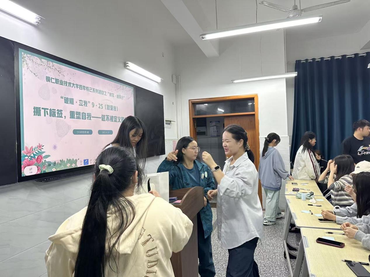 为切实关注学生心理健康成长,引导学子树立积极自我认知、摆脱心理束缚,践行“爱自己”的生活理念,近期,铜仁职业技术大学药学院各班级以学校“秋实・心同行”系列活动为依托,陆续开展“破框・立我”“撕下标签,重塑自我” 等主题心理健康活动。各班级围绕“9・25(就爱我)”核心寓意,通过丰富多样的互动形式,为同学们搭建了情绪释放、自我革新的平台,让大家在温馨氛围中收获成长力量。