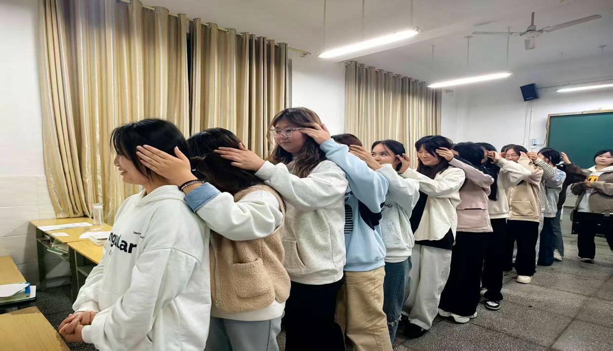 理论学习后,在团体辅导室,心理委员围坐成圈,开展“情绪卡牌解读”练习,用生活化的语言描述情绪的表现,共同探讨朋辈沟通的话术。隔壁教室则开展了“心晴传递”游戏:心理气象员排成一列,前一位同学轻拍肩膀传递“关心”,后一位同学描述情绪并传递给下一人。活动现场,氛围热烈。