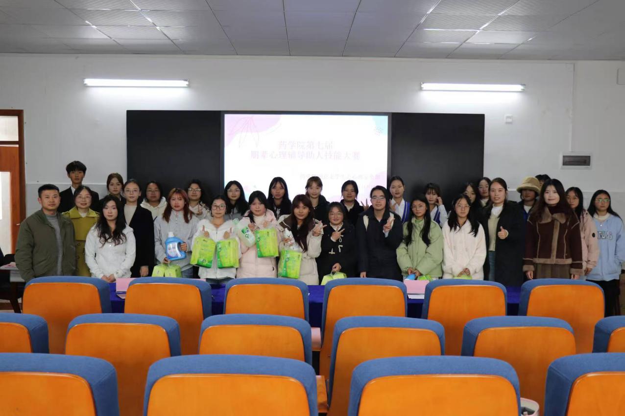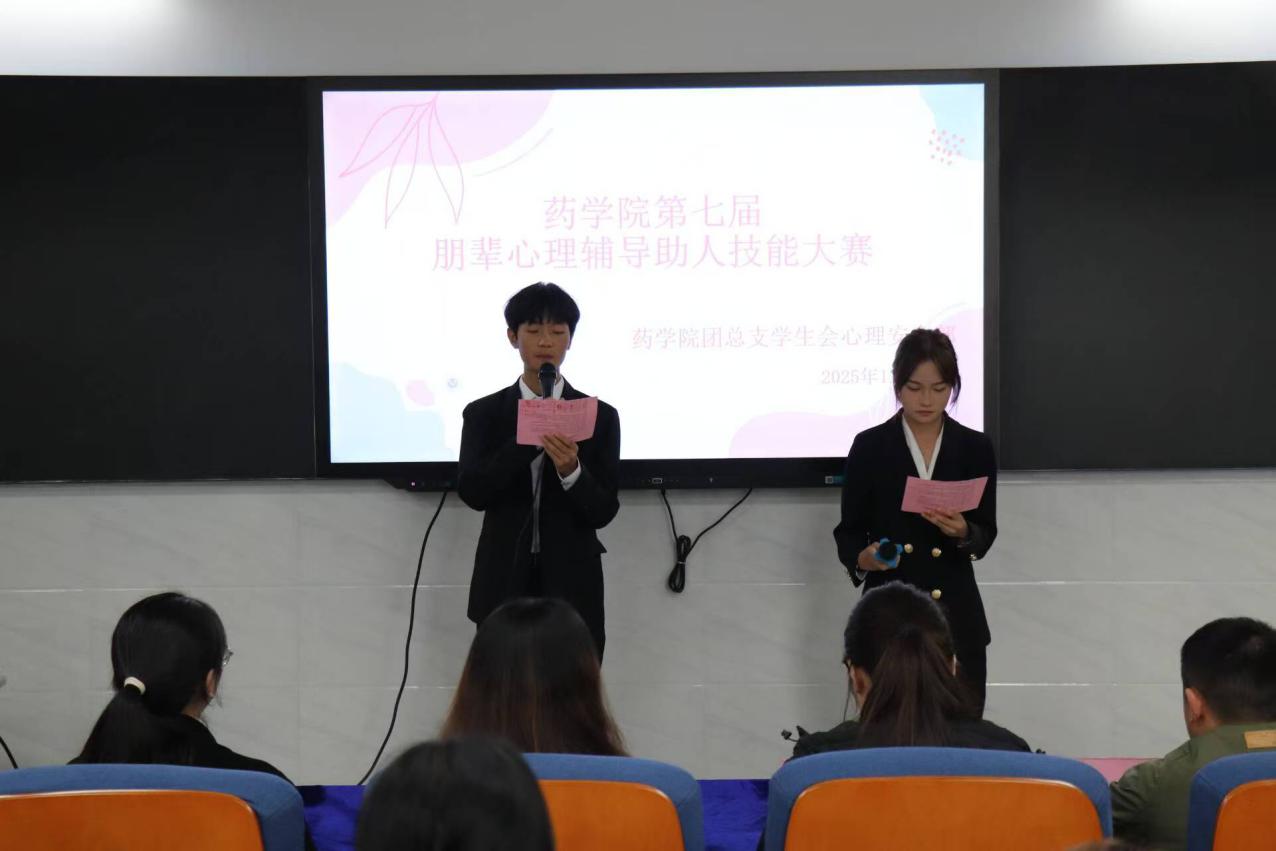 为宣传心理健康知识,全面提升朋辈心理辅导助人技能,切 实发挥朋辈辅导作用,营造关注心理健康、重视朋辈心理支持的 校园氛围,11 月 18 日 12:20,药学院全体学生于 2-1 会议室举 行朋辈心理辅导助人技能大赛活动,本次活动由吴基叶和兰樨同 学主持。学生科晏薇娜老师、张稳老师、李绣菊老师、邓伟老师、 郭路仙老师担任本次大赛评委。
