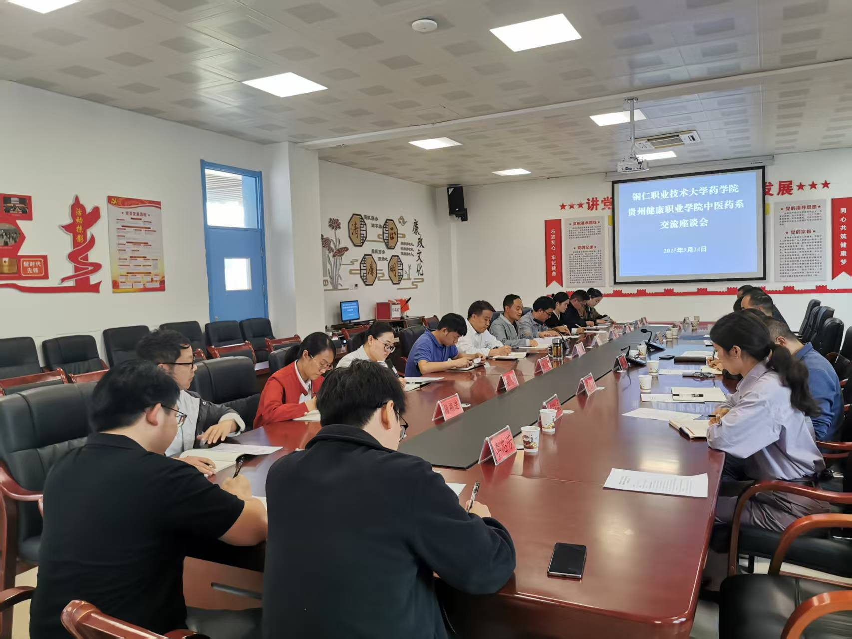 为深化校际合作,整合优质教育资源,助力贵州健康事业与中医药产业高质量发展,2025年9月24日14:30,铜仁职业技术大学药学院院长胡美忠率药品生产技术高水平专业群各模块负责人一行9人,赴贵州健康职业学院中医药系开展调研交流座谈会。贵州健康职业学院纪委委员、中医药系党总支书记田松明,中医药系党总支副书记、主任周斌及系内专业带头人、科室负责人等参会,会议由周斌主持。