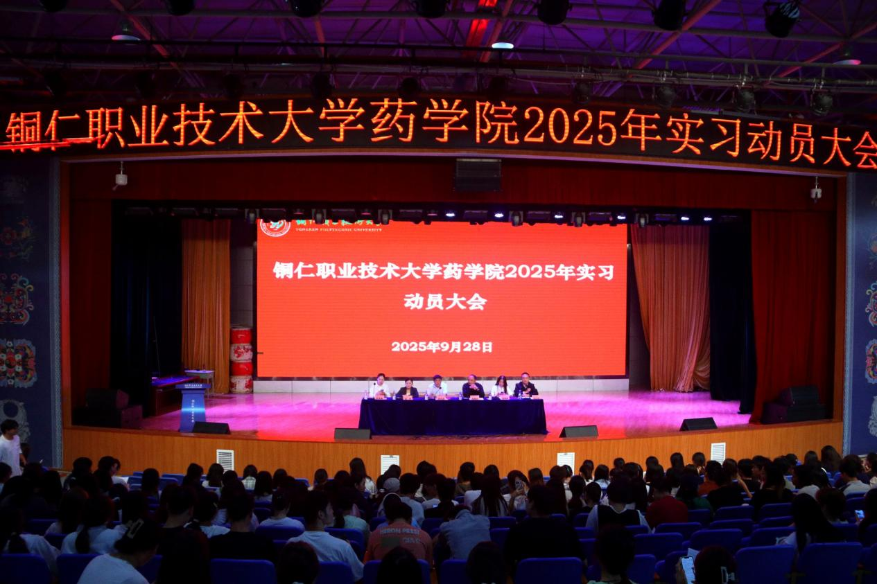为扎实高效推进学生实习工作,引导学生顺利完成从课堂到职场的角色转换,近日,铜仁职业技术大学药学院隆重举行了2025年学生实习动员大会。药学院党总支书记郑大志、院长胡美忠、副院长刘杰、办公室主任谭琪明、学生科科长龙正标、教务科科长夏俊丽、各班班主任以及2023级全体511名实习生共同参加了此次大会。